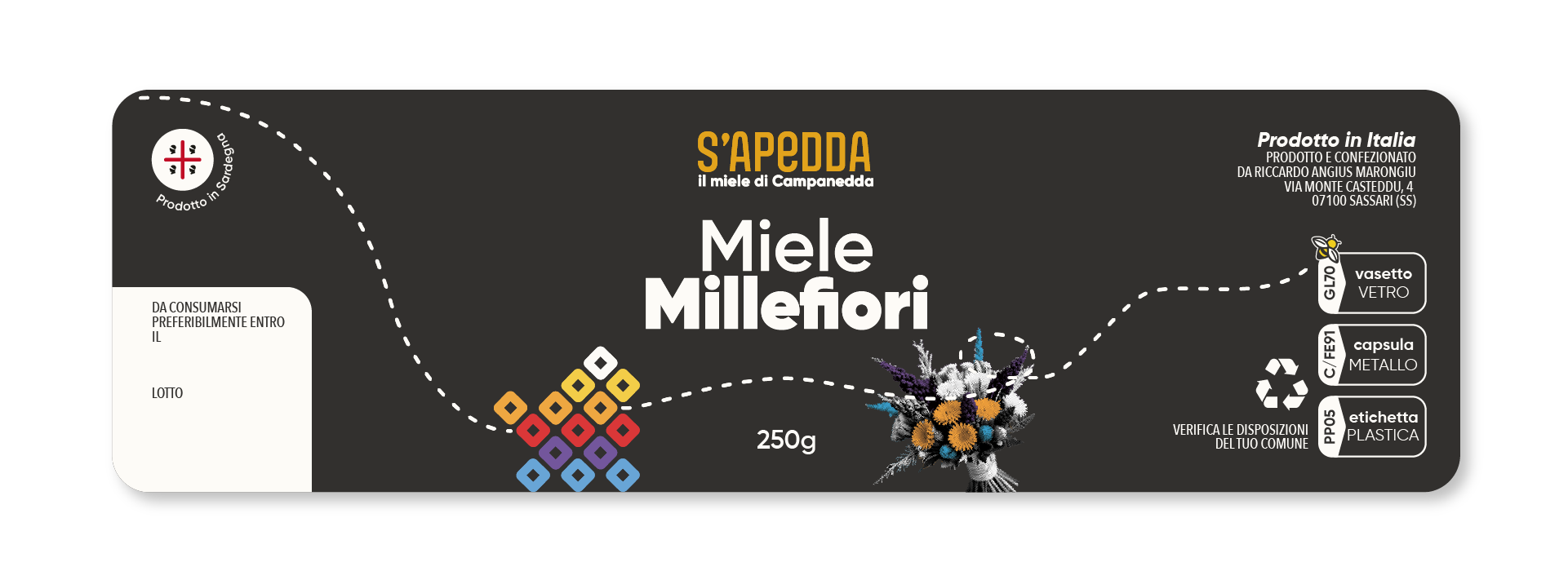 Dalla creazione del naming “s’Apedda” – che evoca immediatamente l’origine sarda e la tradizione apistica – fino alla progettazone dell’identità di marca.